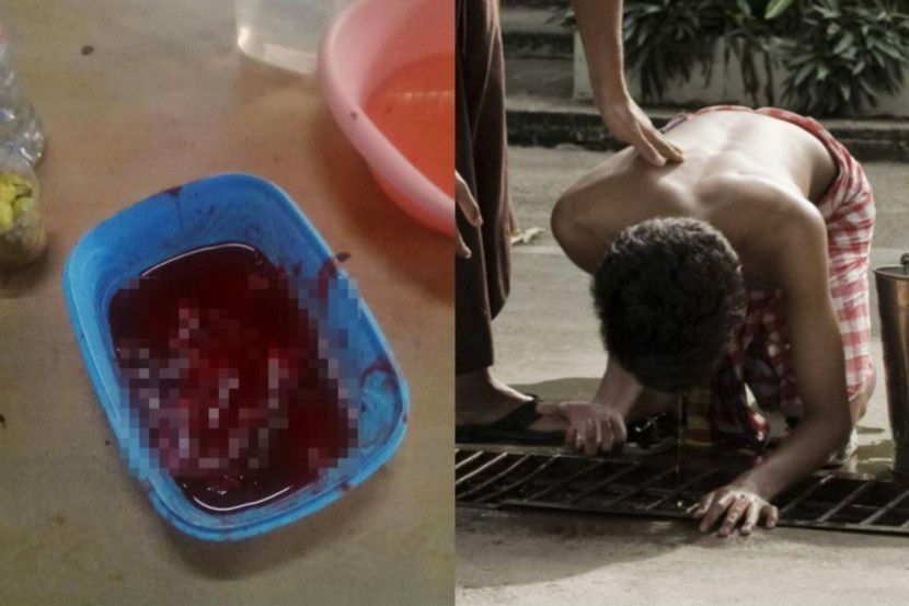 Dalam hantaran tersebut, wanita itu turut memuat naik gambar cecair dipercayai muntah bercampur darah dalam sebuah bekas berwarna biru.