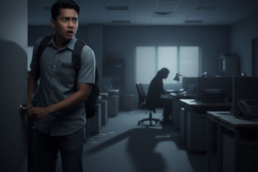 Cakap-cakap yang mengaitkan kematian itu dengan gangguan seram di pejabat mulai berlegar-legar, membuatkan dia sering termenung dan resah sendirian.