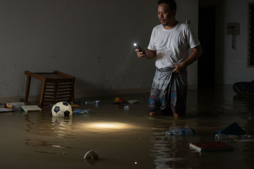 Malam itu, air terus naik hingga mencecah pinggang, memaksa Amri terus berjaga bagi memantau rumahnya.