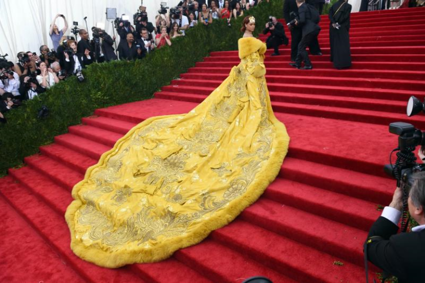 Gaun kuning diraja lengkap dengan cape berbulu serta sulaman corak berbentuk flora cukup meninggalkan kesan bukan sahaja kepada penyanyi lagu Umbrella itu, namun pereka fesyennya.