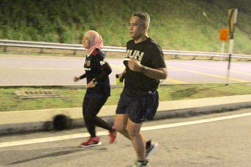 Elleney Merynda Wasli (kiri) bersama Mohd Fadzil Khalid tidak ketinggalan melakukan aktiviti larian pada waktu malam. Gambar hiasan. Foto: The Star