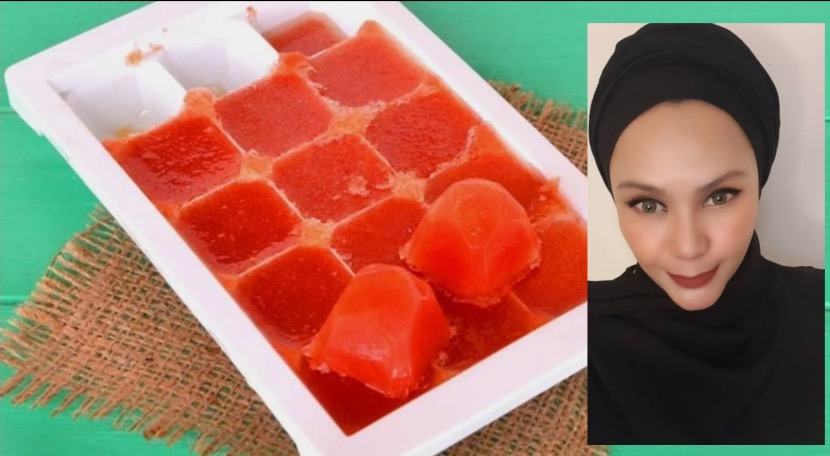 Cara-cara penyediaan: Tomato dilenyek, manakala kunyit ditumbuk. Selepas itu gaulkan bersama dan letakkannya di dalam ‘ice cube’ dan sejuk beku untuk tempoh empat hingga 5 jam.
