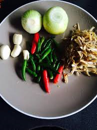 Daun ketumbar, serai, cili padi dan bawang merah dihiris nipis.