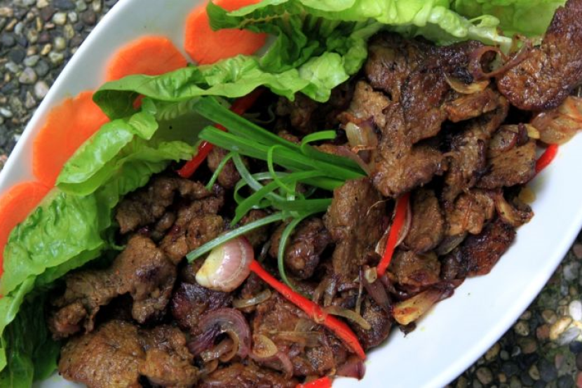 Sementara itu, panaskan kuali dan masukkan daging untuk digoreng sehingga ia bertukar keperangan. Sesudah itu, masukkan minyak sapi dan gaul rata.